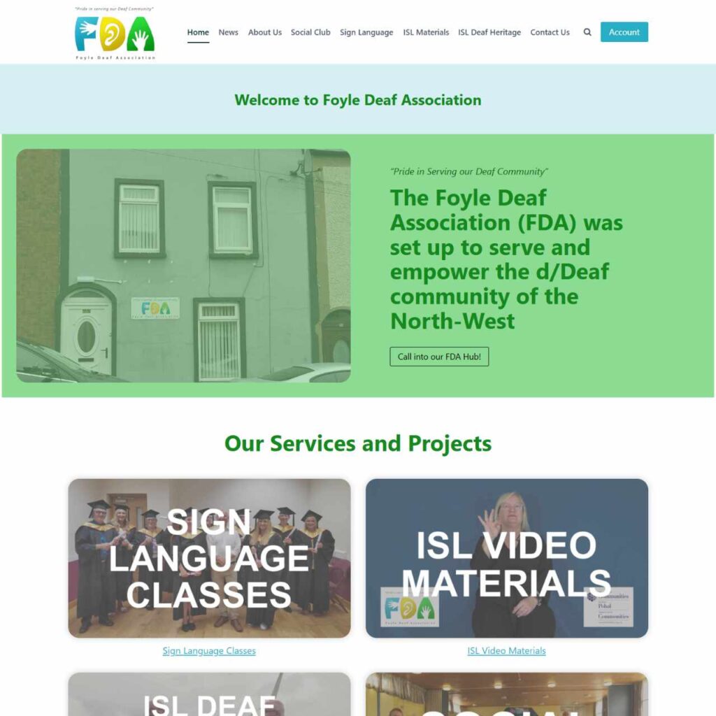 These are my most recent website projects, involving setting up a membership site, an online shop, and online sign language courses, as well as my filming and video editing work with the ISL Deaf Heritage Project at the Foyle Deaf Association. You can watch these videos on the FDA website.